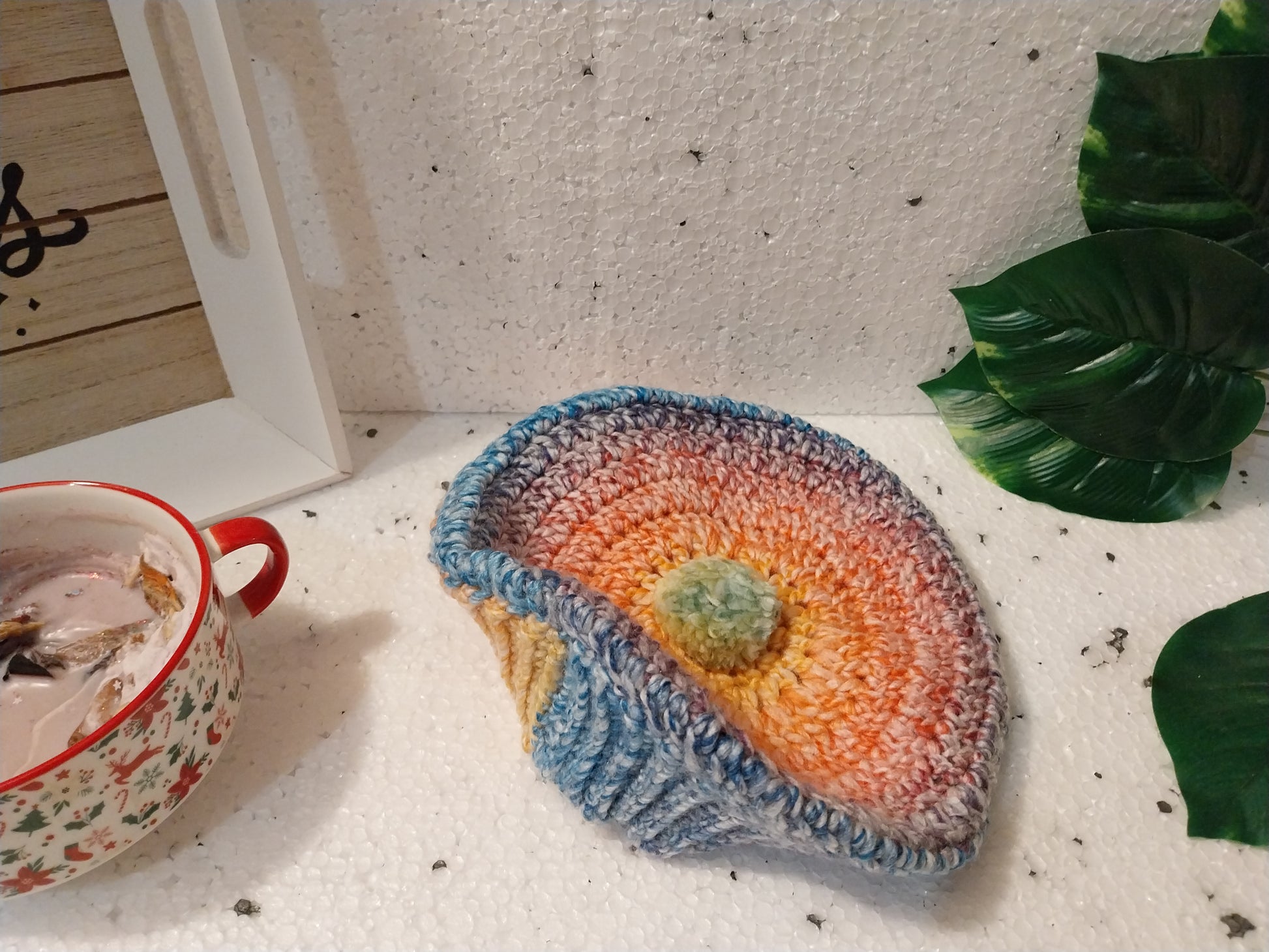 Chaque maille capture la lumière d'un lever de soleil et la transforme en une douce caresse pour votre tête. Ses nuances dégradées - du bleu rêveur à l'orange doré - évoquent un ciel enchanté après la pluie, promesse de chaleur et de bonheur.